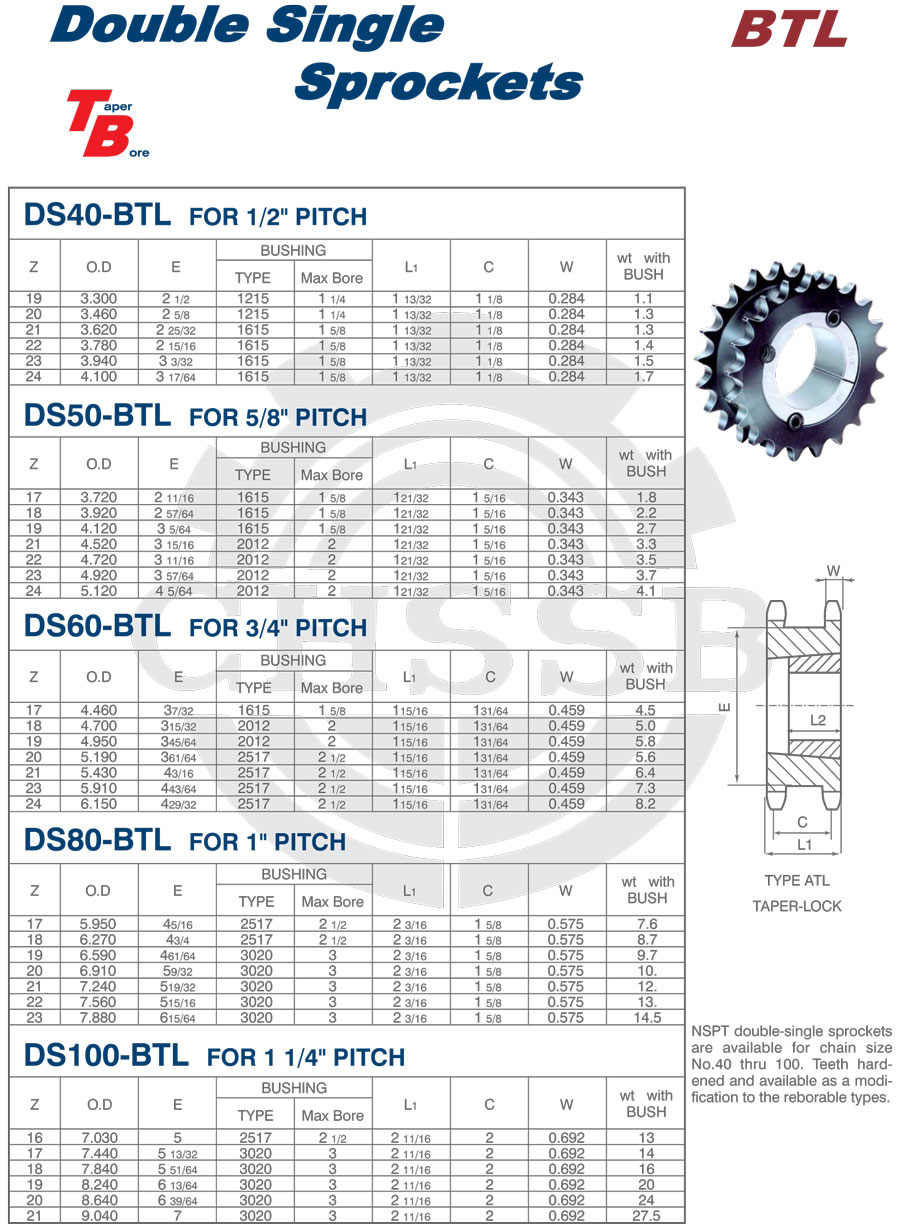 Range of product: ADSI:(DS40-BTL/DS50-BTL/DS60-BTL/DS80-BTL/DS100-BTL) Inch size product (Apply to ANSI market) BTL Double Single Sprockets