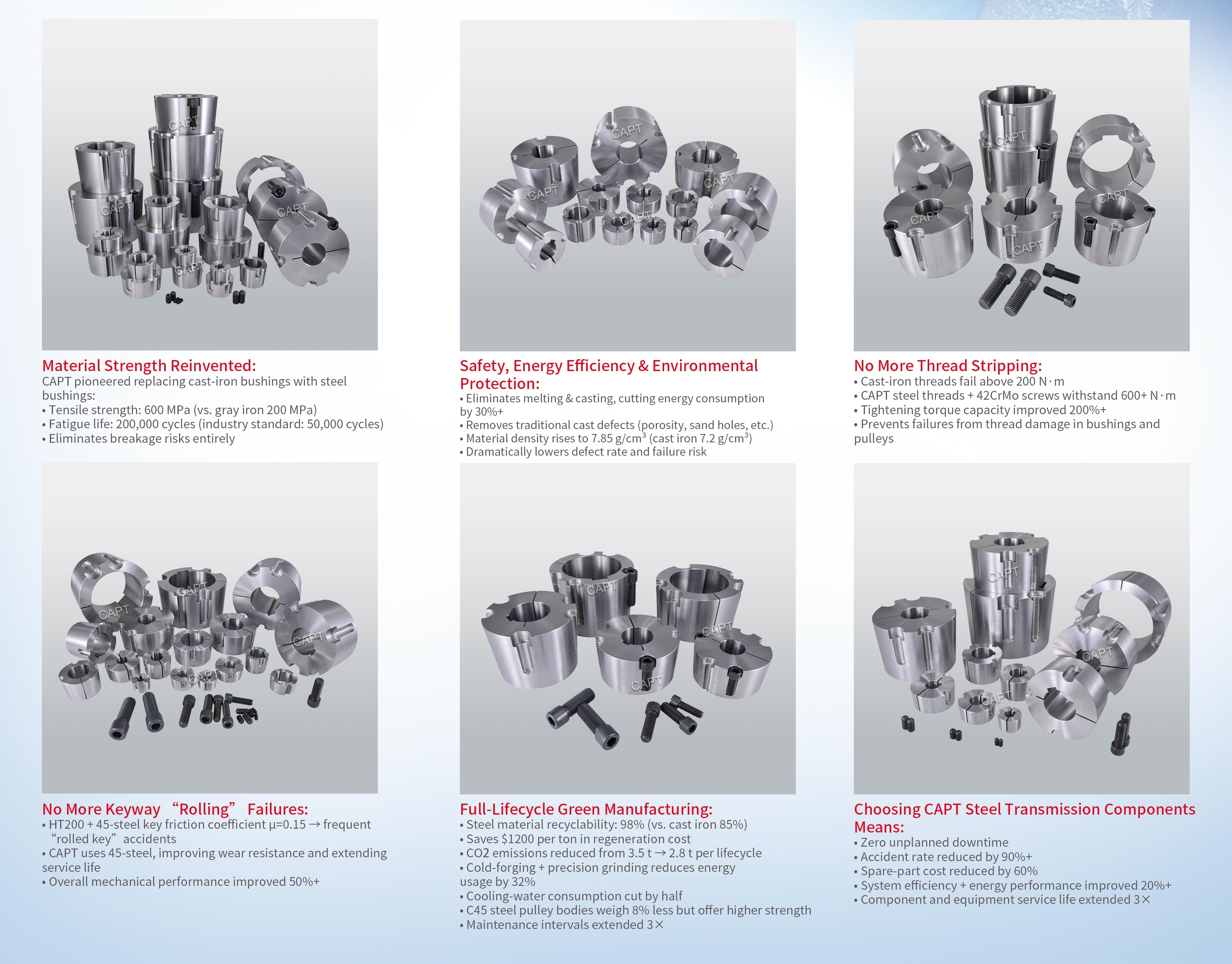 As China’s pioneer in steel taper-bushing R&D and the official drafter of the national taper-bushing standard since 1986, CAPT has dedicated four decades to high-performance transmission manufacturing. Built on high strength, high precision, component zero defects, sustainability, and long service life, CAPT remains the industry leader in upgrading taper bushings, pulleys, and sprockets.