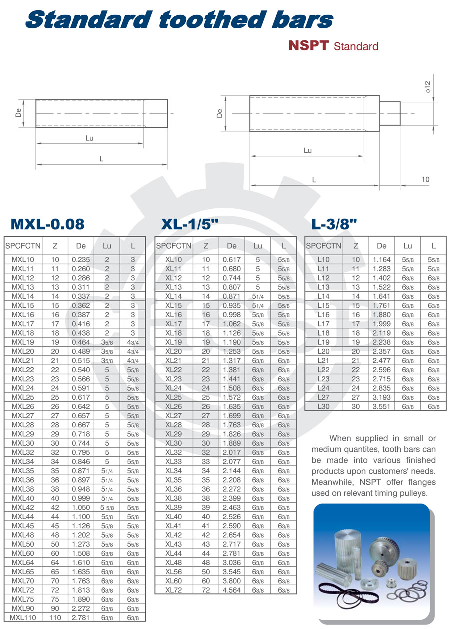 產品范圍: 美標/歐標:(MXL-0.08/XL-1/5/L-3/8) 英制尺寸產品(適用于美標市場) 公制尺寸產品(適用于歐標市場) 梯形齒齒棒