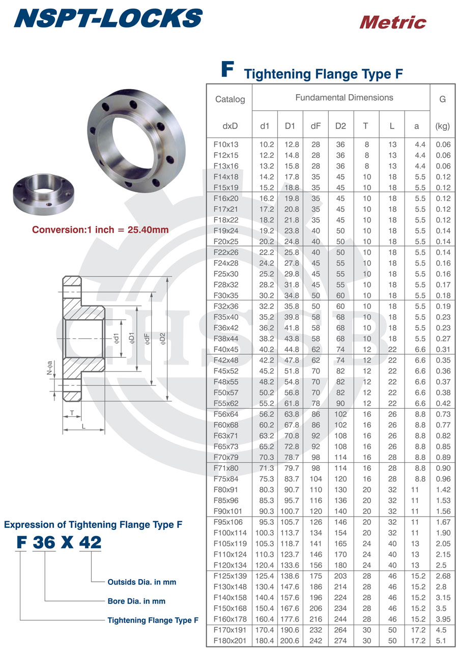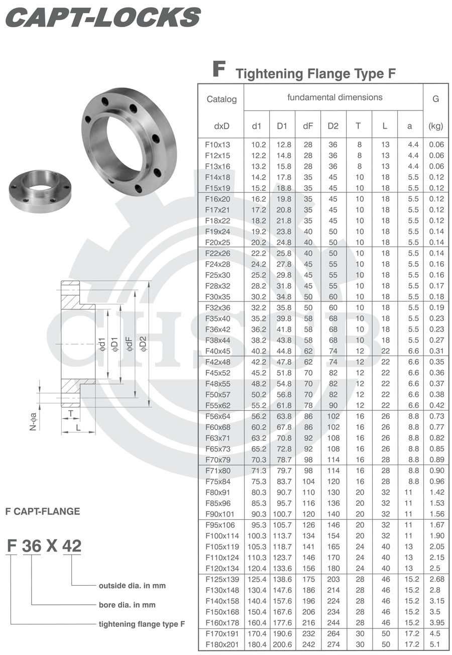 美標(biāo)/歐標(biāo) | F(Tightening Flange Type F)(Metric) | F10x13至F180x201 |