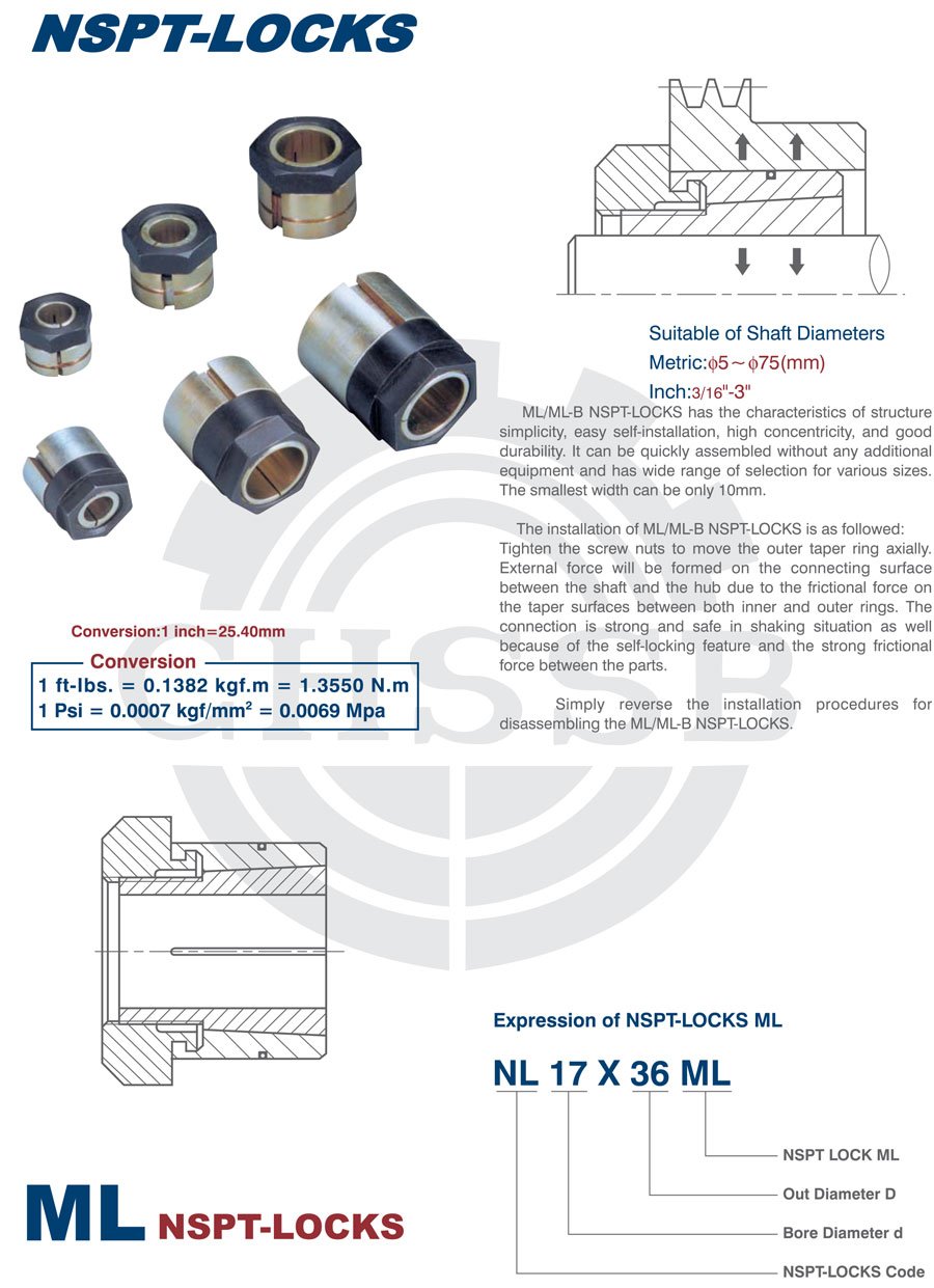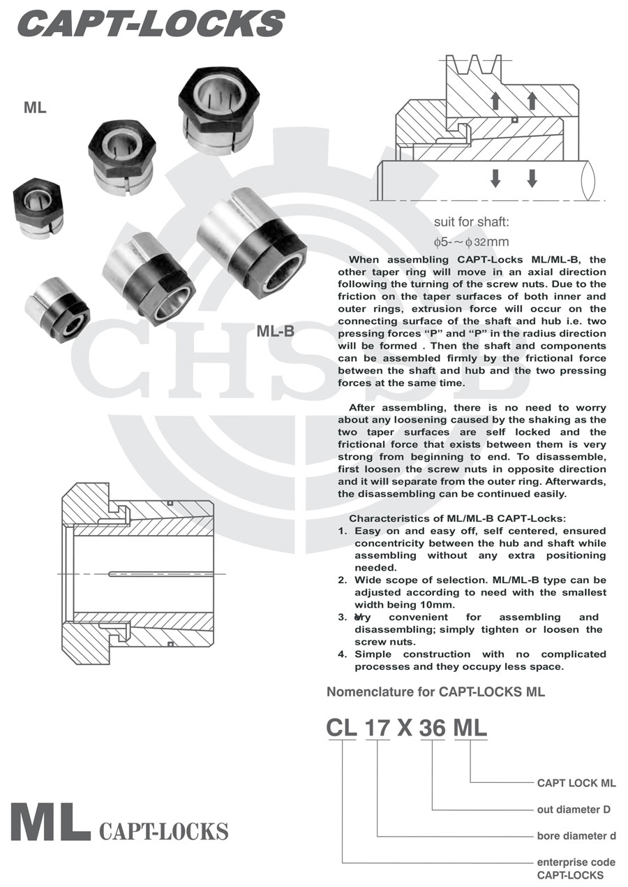 產品范圍: 美標/歐標:(ML) 英制尺寸產品(適用于美標市場) 公制尺寸產品(適用于歐標市場) ML型脹套 脹緊套 漲緊套 漲緊聯結器 鎖緊聯結盤